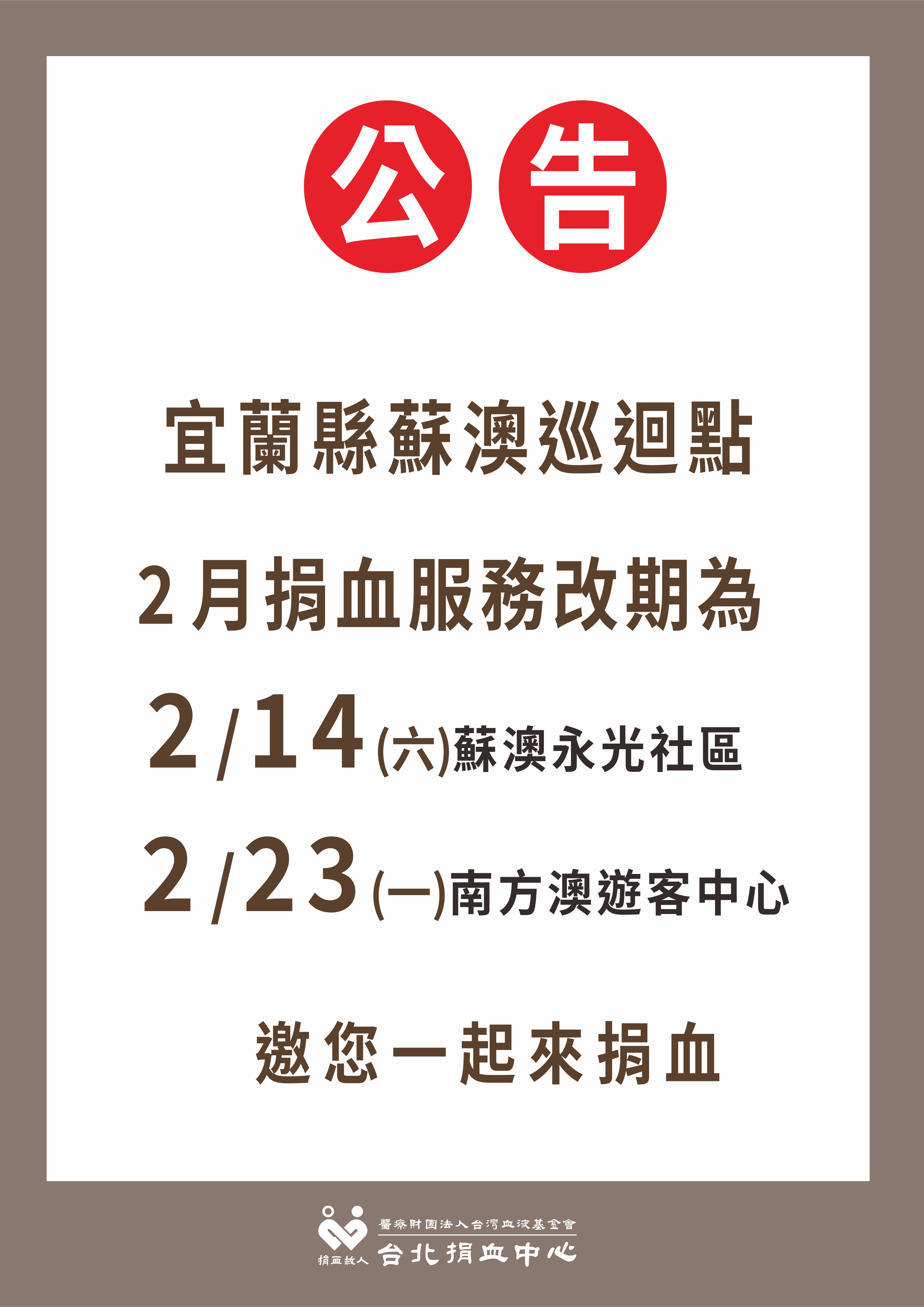 【宜蘭蘇澳巡迴點】115年2月捐血服務改期